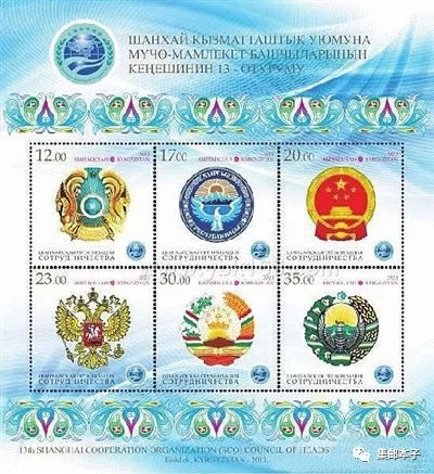2013年9月13日,上合组织第13次峰会在吉尔吉斯斯坦首都比什凯克举行。吉尔吉斯斯坦为此发行纪念邮票一套6枚,图案为6个成员国的国徽(图3)。这是吉尔吉斯斯坦第二次为上合组织峰会发行纪念邮票。