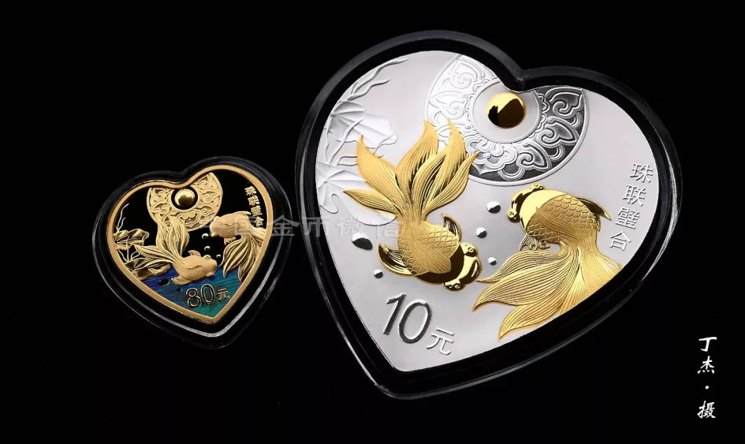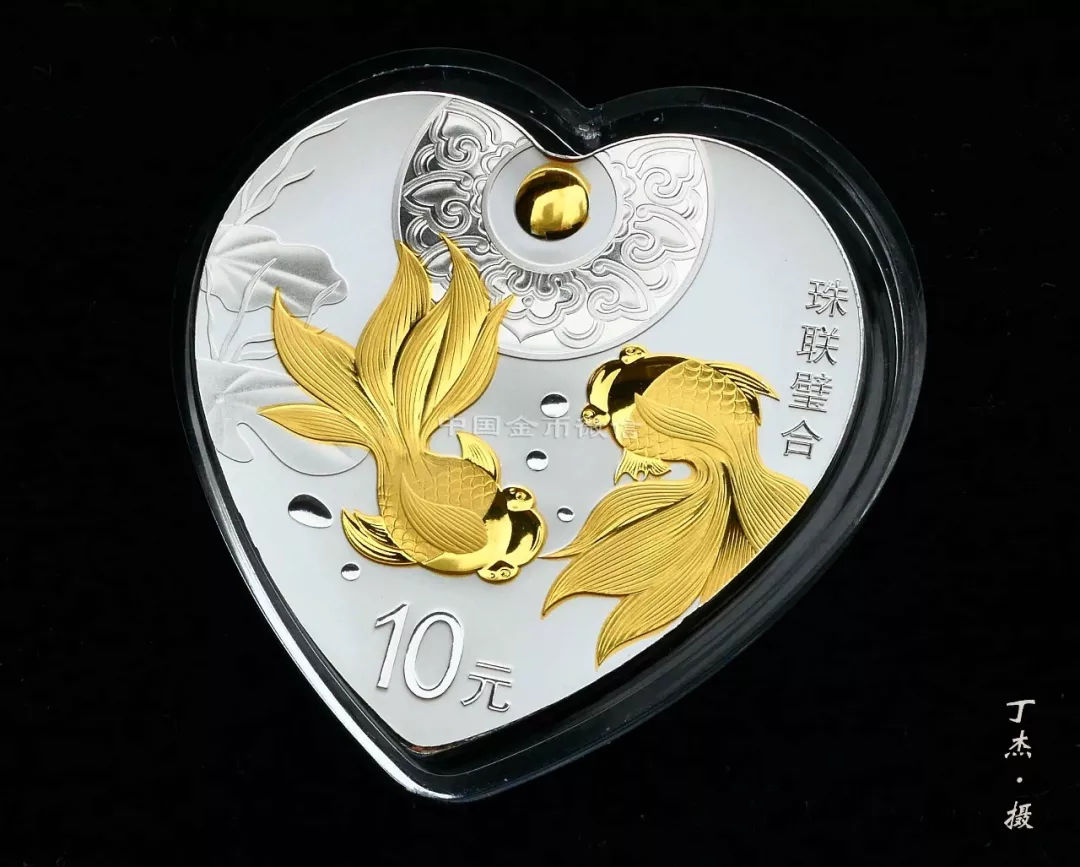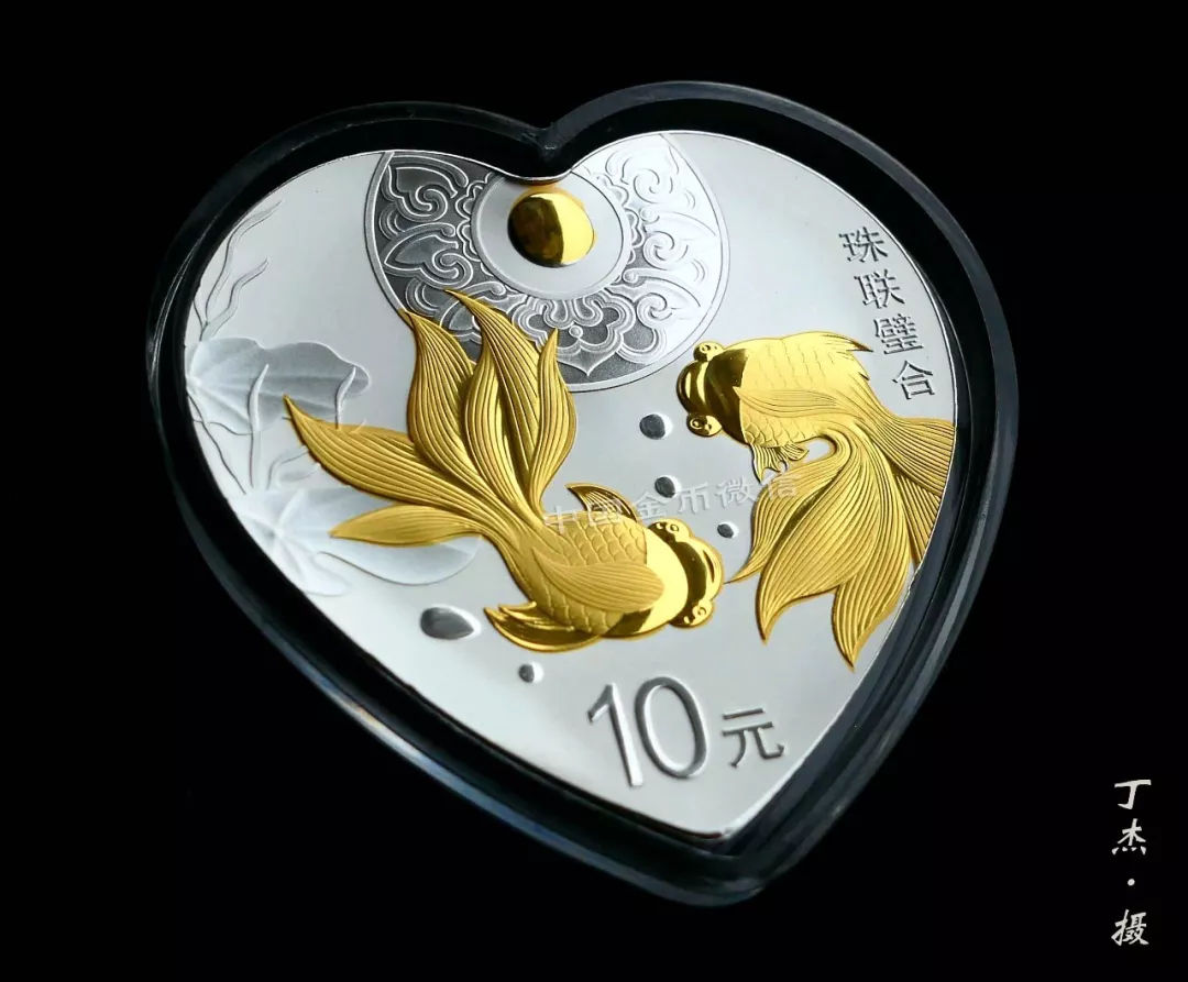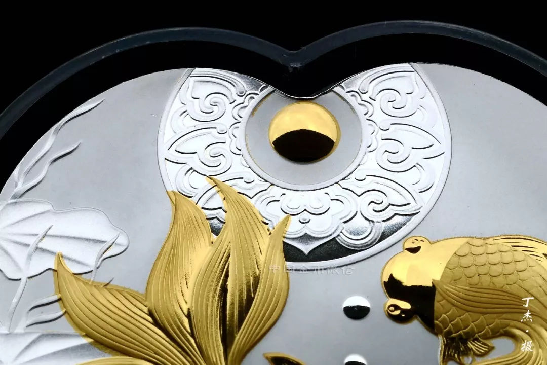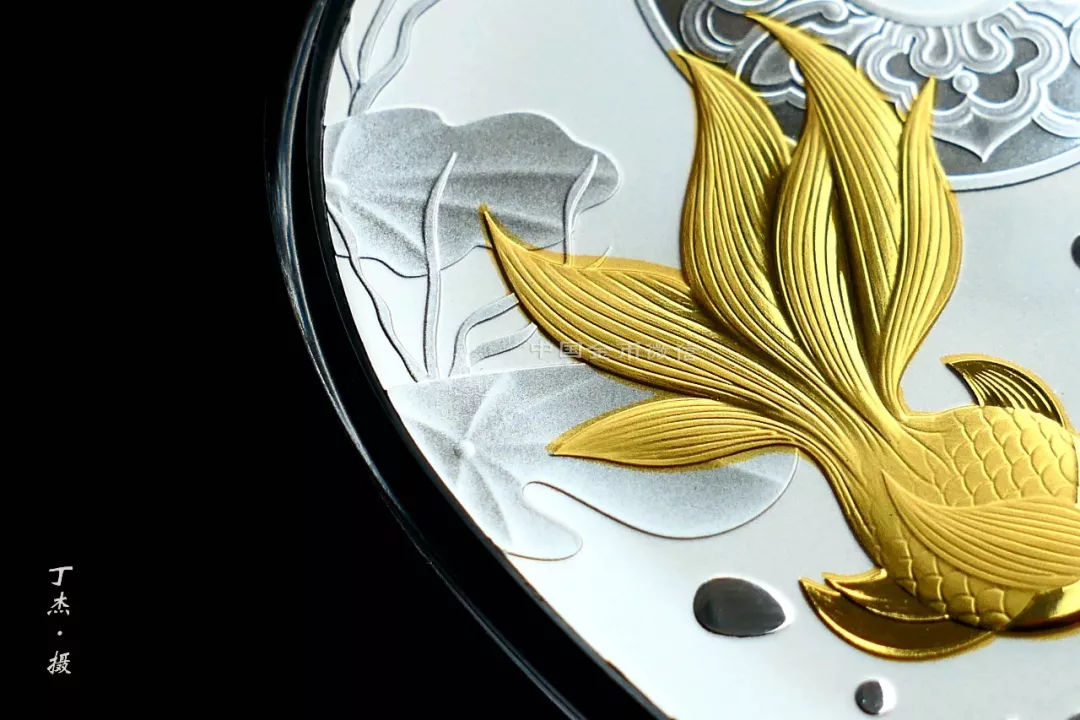 30克“珠联璧合”银币最耀眼的就是局部镀金。在一弯清水中,两条金鱼首尾追逐游弋,自由欢快。