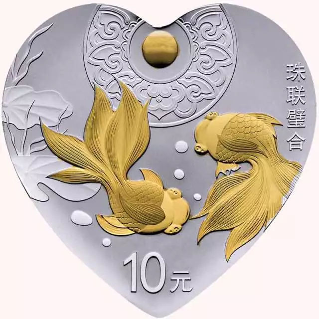 “珠联璧合”金银纪念币,日月的光环映照其间,体现美感的同时,又加入了吉祥祝福。币面下方中间部分两条金鱼首尾相连,欢快地游弋,寓意吉祥如意和年年有余。左上方荷叶点缀画面,使整个画面更显和谐美好,有大同之意。