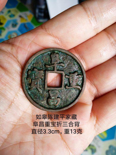 收藏者:如皋陈建平阜昌重宝,是金代伪齐政权刘豫(金人扶植政权)阜昌年间铸造的钱币。旧谱说仅见折三,另录有“阜昌通宝”小平,“阜昌元宝”折二,均为真篆对照,光背,直径约35mm,钱文清晰精美。