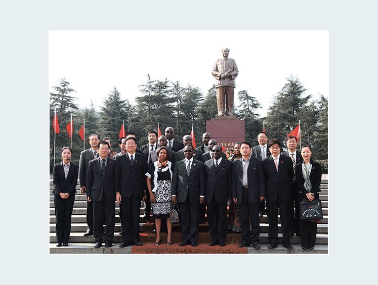 2013年11月20日,科特迪瓦国民议会议长纪尧姆•索罗(前排右五)、科特迪瓦驻华大使科菲•尼凯斯(前排右四)一行来到韶山,在全国人大内务司法委员会委员、中共中央直属机关工委副书记赵凯(前排左三),全国人大常委会办公厅外事局副局长熊伟(前排左二),湖南省韶山管理局副局长晏晓明(前排右三)等人的陪同下瞻仰毛主席铜像并敬献花篮。随后,纪尧姆•索罗一行还参观了毛泽东同志故居、韶山毛泽东同志纪念馆等景点。在毛泽东同志故居,纪尧姆•索罗详细听取了毛泽东年少时的经历和青年时投身革命生涯的介绍。