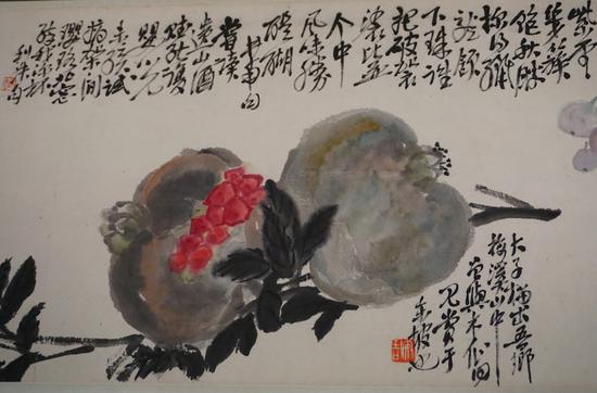 吴昌硕 《珍果图卷》,依次绘制荔枝、大桃、西瓜、倭瓜。此次展出的吴昌硕画中,题材涉及梅竹、松石、葡萄、紫藤、山茶、葫芦、天竹、牡丹、杂卉等。吴昌硕画着色极其讲究,打破古人窠臼,偏爱西洋红,有时画花会大胆地把这种红色堆上去。画叶子又用很浓的绿、黄及焦墨。常以红、黄、绿色调入赭墨,喜欢在冲突中取得协调。他的着色方法在传统基础上,汲取了民间绘画的着色特点,渐成雅俗共赏之风。他专精花卉,亦能山水,偶作人物,曾画钟馗捉鬼,讽刺当时“人少鬼多”的社会。