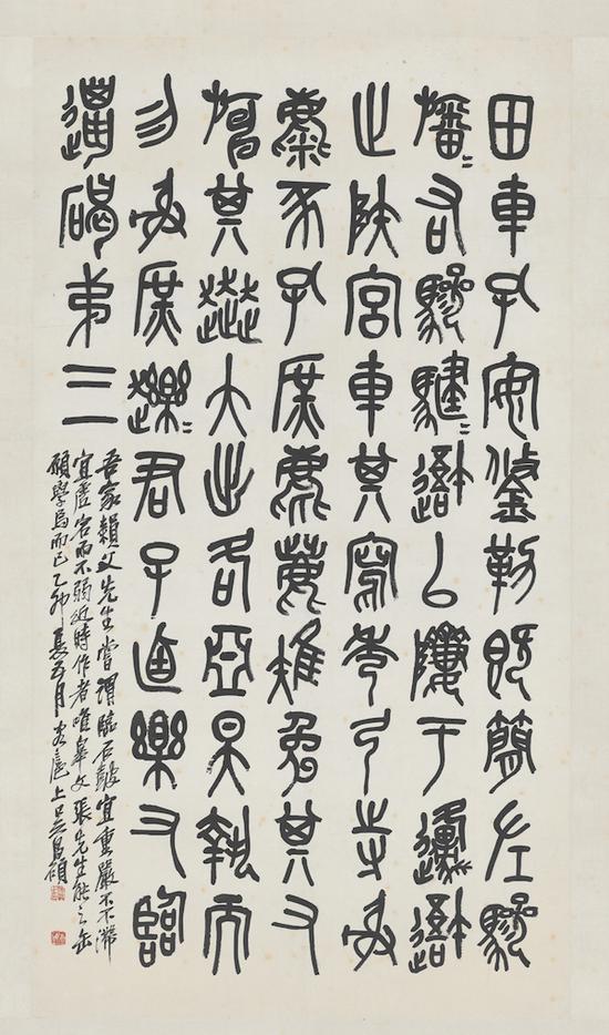 吴昌硕《篆书临石鼓文轴》,书于1915年,系通临“田车鼓”。