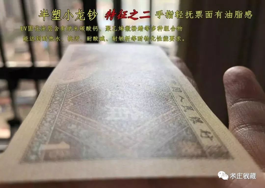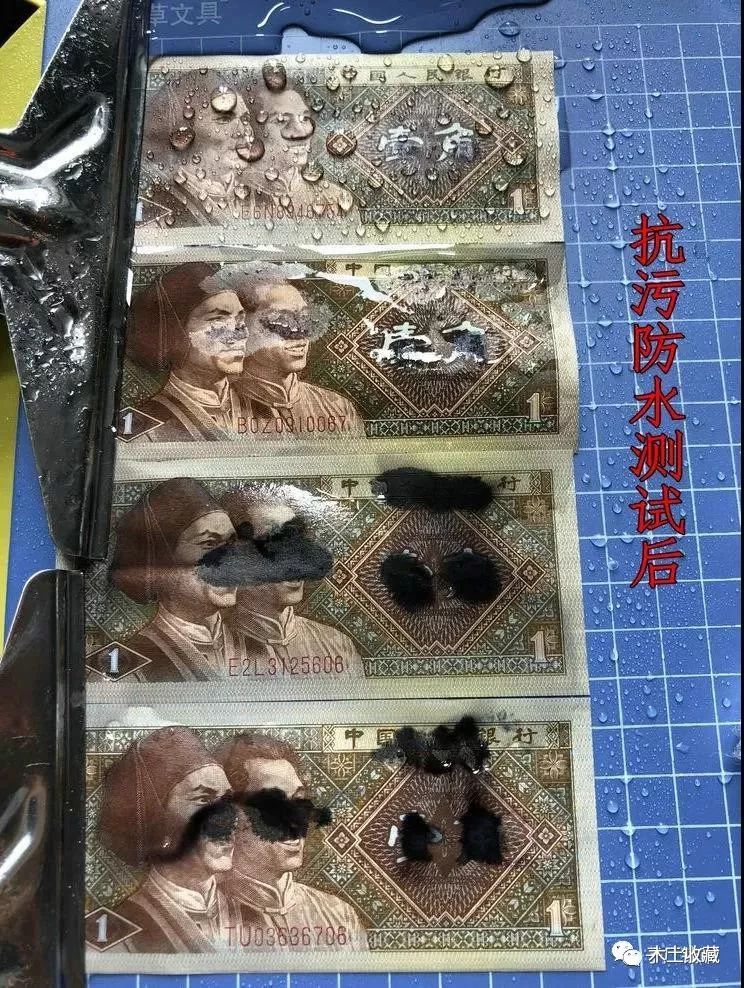 这张图,就露出马脚了!!!不管之前吹的天花乱坠,有理有据,多么的高大上,这张图片完美的揭示了怎么制作出来的(瞬间名侦探狄仁杰附体)——只需要上个光或者在钞票表面涂一个类似不亲水的东西(比如蜡),就能解决这个问题。当然,和民间专家称的加入什么强湿剂的关系。这也是为什么看不出凸印号码的痕迹,这是在上光过程中压平的原因。