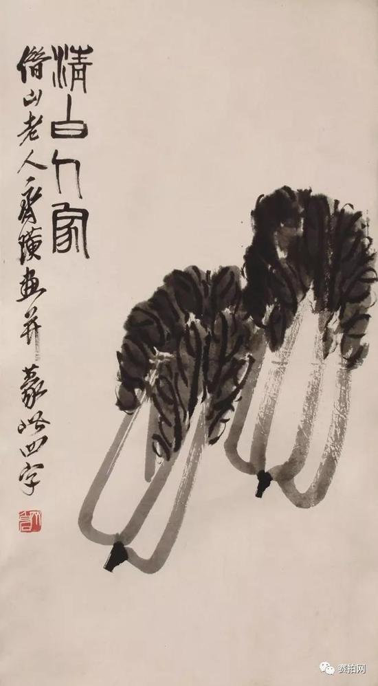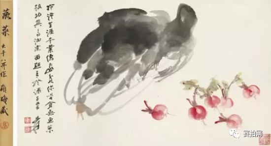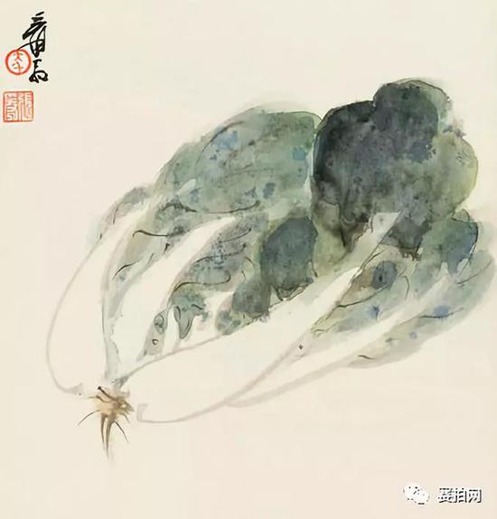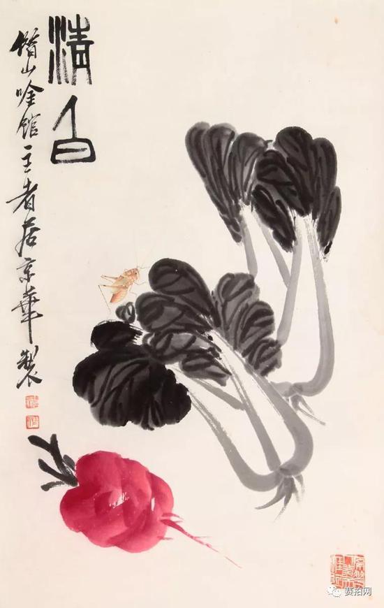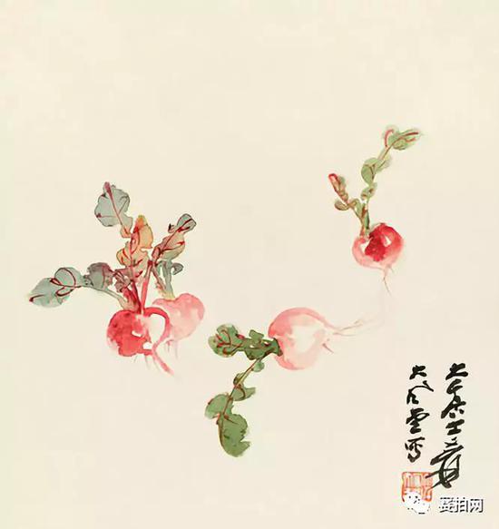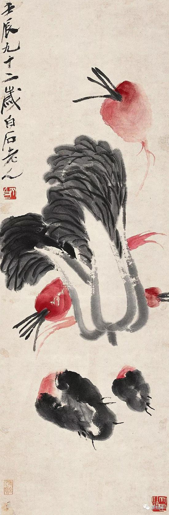 在齐白石众多的绘画题材中菜蔬类作品是最能触及老人思乡情结的一类,他将这些日常所见之物,寄予了深层精神内涵,超越了绘画的内容和形式。齐白石的作品之所以感人、雅俗共赏,是由于他对生活极端热爱,在作品中寄予了真情实感。这在菜蔬类作品中尤为突出。