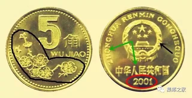 另外一枚是2001年梅花五角。在老三花中,菊花一角和梅花五角发行到2000年截止,只有梅花五角发行到2001年。因此2001年的梅花五角也是老三花的关门币,“中华人民共和国”、“国徽”的关门币。之后发行的新三花硬币,已经没有了国徽和“中华人民共和国”,转变成了“中国人民银行”和各种花的图案。