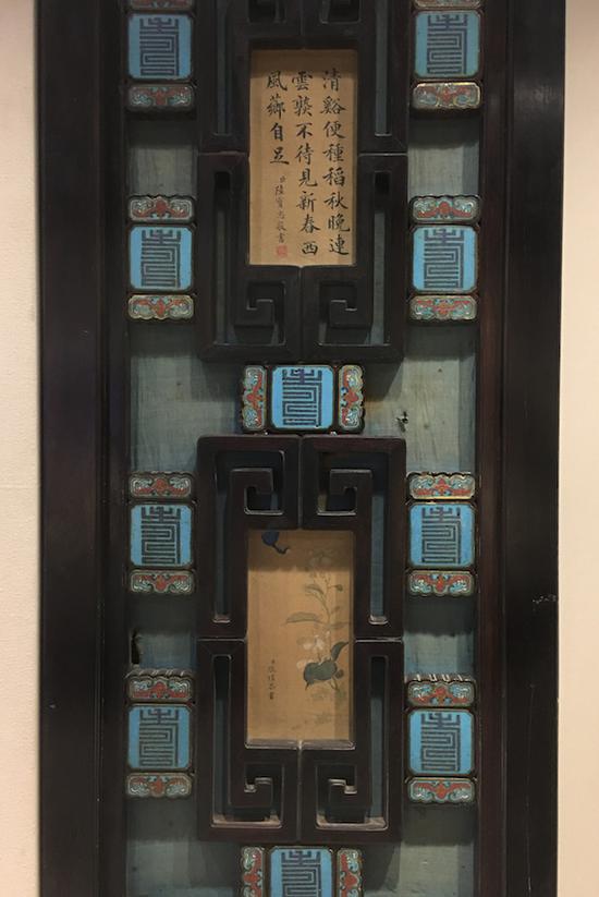 乐寿堂嵌珐琅书画屉心槅扇,包括槅心紫檀回纹灯笼框,卡子花镶嵌蝙蝠夹寿字纹珐琅,槅心双屉夹蓝纱,槅眼双面贴落臣工书画。