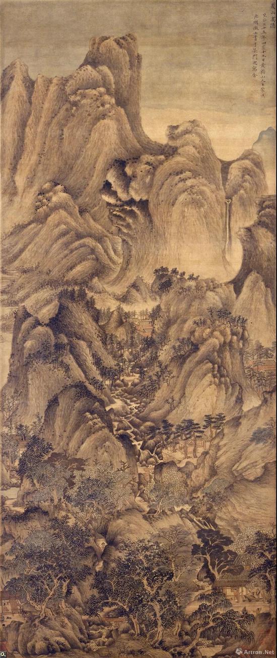 此图设色绘重山叠翠,瀑布孤悬,林阴繁荟,流泉下注。