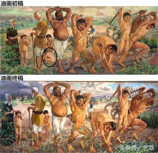 虽然是油画初稿,但这幅《愚公移山》已经相当成熟,对比最终版本可以发现,除左侧老者身后多了一个蹲在地上的小男孩外,构图完全一致。