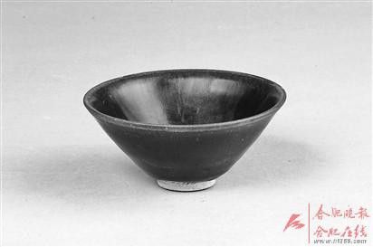 除此香熏之外,另有两件黑釉盏值得一提。其中一件黑釉盏(图2):高5.9厘米,口径12.5厘米,足径3.7厘米。盏为敞口,深腹,矮圈足,胎体较为坚致。盏内外壁均施黑釉,釉层较厚,釉面浓黑而光亮。盏外壁施釉大半,下腹无釉处书有一个“包”字,下腹及器底无釉处可见施有白色化妆土的胎体,化妆土脱落处现黄褐色胎。盏口沿釉层较薄,显一圈紫红色。此盏出土于包拯家族墓群中的包永年墓,根据同出的墓志记载:包永年,字延之,是北宋名臣包拯之孙,宋宣教郎,知鄂州崇阳县事,卒于北宋宣和二年。另一件为黑釉兔毫盏(图1),高4厘米,口径13厘米,底径4.1厘米。盏呈大敞口,浅腹,矮圈足。器内外均施黑釉,釉面有窑变现象,形成兔毫状纹理。出土时,此盏有镶嵌的银边残片,银边宽1.3厘米。此盏出土于合肥包拯家族墓群中的二号墓,虽然未发现墓志,但此墓与上述包永年墓共一个封土堆,很可能是包永年夫人墓,时代应该非常接近,因此这两件黑釉盏都是时代明确的北宋晚期的标准器。