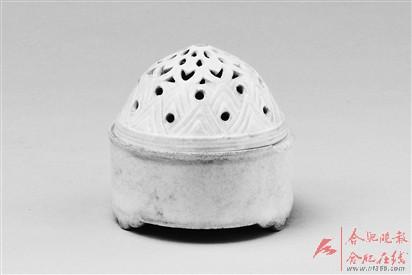 这件景德镇窑影青釉镂空瓷香熏,出土于包氏家族墓群四号墓,也就是包绶夫妇合葬墓。据包绶墓志记载:包绶是包拯的次子,包拯去世时,他才五岁,由长嫂崔氏扶养成人,二十五岁时受“荫补”,历任濠州团练判官、少府监丞、国子监丞、汝州通判等职,“生平清苦守节,廉白是务,遗外声利,罕有伦比”。最终,他在赴任潭州通判的途中病故。包绶病故后,人们打开他的行李,除“诰轴著述外,曾无毫发所积为后日计者”。1973年的发掘证实了这一点,文物工作者只从包绶棺木内发现了几件瓷器、砚台、残墨、残铜镜和一些铜钱等少量物品。而这件香熏以及同出的砚台和墨都是古代文人必备的文房用品,这也从另一个侧面反映了包绶一生与书为伴的事实。另需要注意的是,这件影青釉香熏的炉身口沿处残缺一部分,器物表面磨损严重,还有几道裂纹,从这些使用痕迹看,这件香熏定是包绶生前使用了多年的物品,反映出墓主人生活朴素,承载了合肥包氏“清廉节俭”的家族文化。