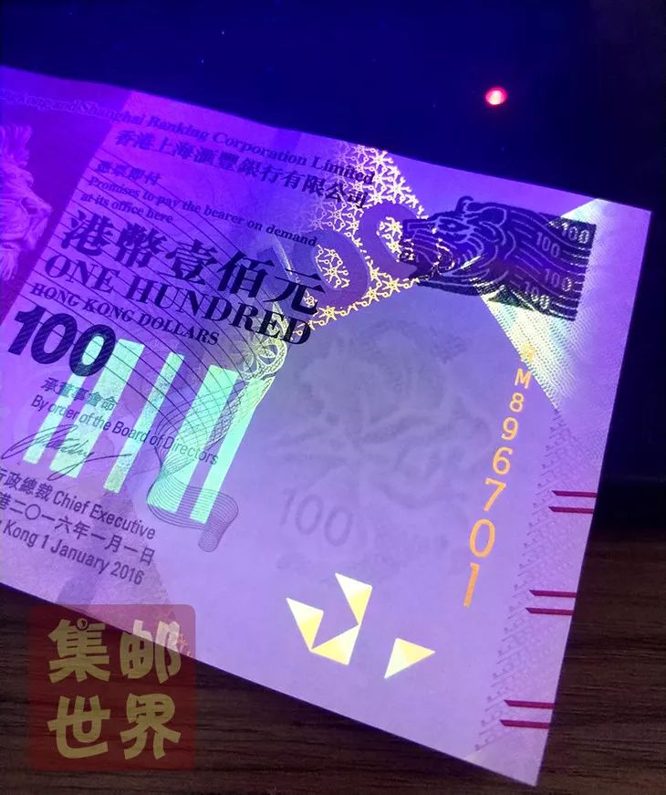 全球领先的防伪技术:动感变色图案、变色开窗金属线、隐藏银码、珠光图案、高透水光印、荧光透视图案等防伪手段。比较重要的防伪特征如动感变色图案——斜看钞票时图案由金色变绿色,并可见一条光纹上下滚动;变色开窗金属线——金属线由紫红变绿色等。