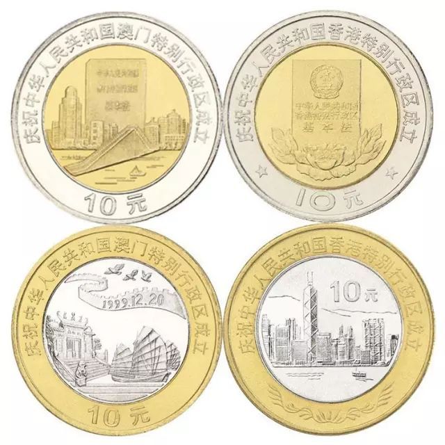 今年是香港回归21周年纪念。1997年,中国人民银行发行了香港特区成立纪念币一对2枚。两年后澳门回归时,又发行了澳门特区成立纪念币一对2枚。前后发行的这4枚纪念币,组成了完整的一套“香港澳门回归纪念币”。