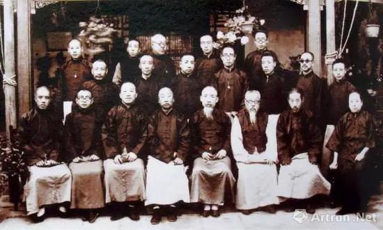 1920年中国画学研究会在北京成立摄于中央公园董事会。一排左起:第三人金城、第五人周肇祥、第六人陈汉章、第八人金城之妹金章,二排左起陈咸栋、刘子久,第五人吴熙曾、第六人胡佩衡、第七人管平,三排左起第二人马晋