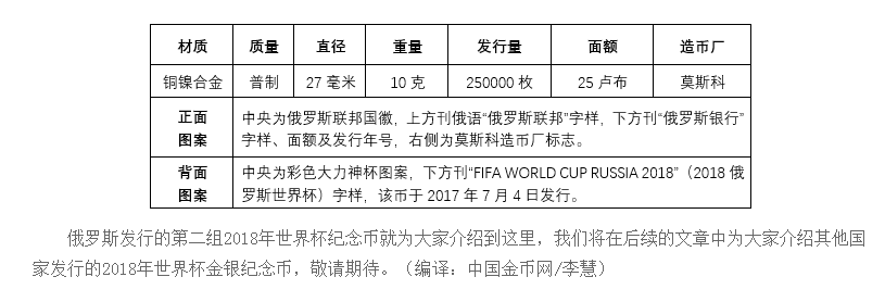 前面的文章中,我们为大家介绍了俄罗斯2018年世界杯纪念币(第一组),今天我们将为大家介绍第二组。俄罗斯2018年世界杯纪念币(第二组)于2017年7月4日和12月5日分两次发行,共13枚,包含金币1枚, 银币8枚,流通纪念币4枚,总数较第一组增加5枚。与第一组相同的是,金银纪念币由圣彼得堡造币厂铸造,流通纪念币由莫斯科造币厂铸造。下面让我们来欣赏俄罗斯2018年世界杯纪念币(第二组)。