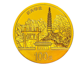 杭州西湖,历来令人称道的不只是它的秀丽风光,更有它背后所蕴含的文化内涵。文化景观背后的故事向来为人们所津津乐道。金币图案上的西泠印社,在方寸之间就能让人感受到风雅景致和金石韵味。币面上,由近及远依次是西泠印牌匾、石坊和华严经塔。