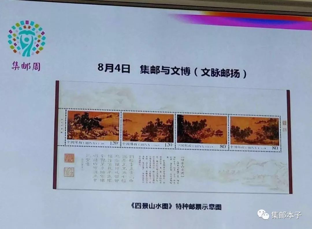 在新闻发布会上,高山介绍,8月4日为“文脉邮扬”主题日,邮政集团公司将与故宫博物院联合举办“‘2018集邮周’启动仪式暨《四景山水图》特种邮票首发式”,全国各省邮政分公司也将联合当地博物馆、美术馆以及文化机构等举办邮票首发、展览、鉴赏、学术交流等活动。