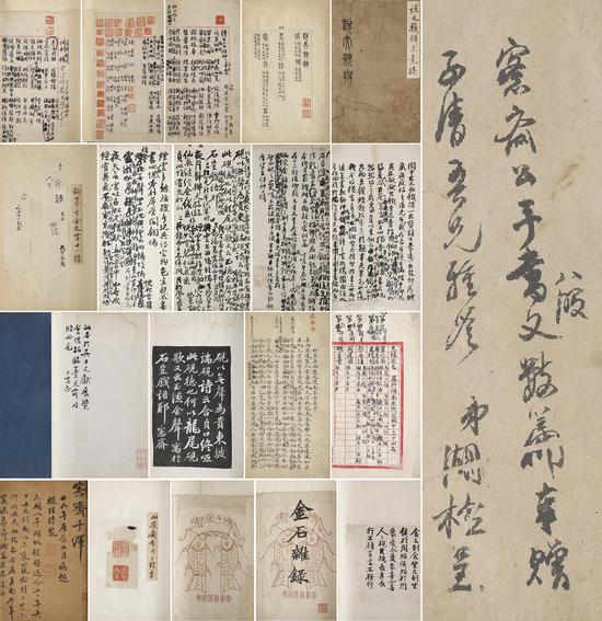 民国八年(1919年),吴湖帆检理其祖父吴大澂诗文金石手稿十余种,赠予表兄陈子清雅鉴。此稿内容极丰,內汇集吴大澂学术著述如《说文类辨》未尽稿、《续百家姓印》草稿,秦权、铜符、砚铭等金石题跋底稿(其中秦权诗题为西泠印社2016春拍吴大澂拓赠王懿荣秦权拓本的诗歌初稿),勾摹吉金文字、秦汉瓦、权量以及访碑记等金石杂录,光绪十九年(1894)任湖南巡抚期间手录恩科湖南武乡名单,日常读书随录、名刺、常用印、专用笺纸、早年求学时期所作八股文稿等,所涉门类颇广,时间跨度大。