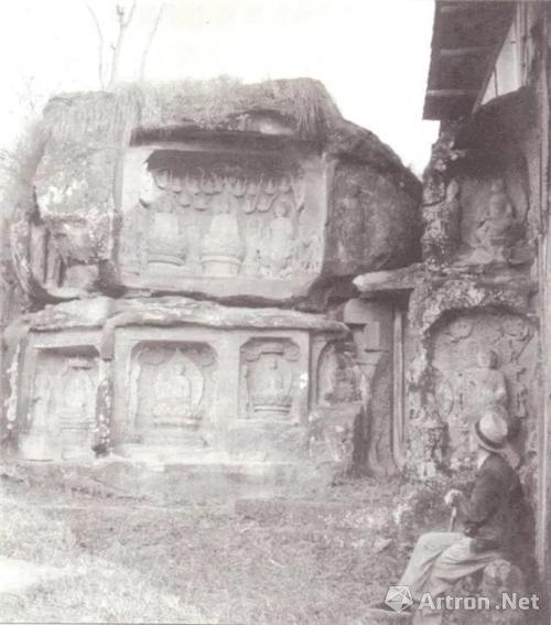 照片中的北山佛湾一处晚唐造像密集区域,荒草丛生,造像龛窟下方崎岖不平,大小不一的石头,四处散落,梁思成便坐在一石凳之上,仔细地凝视着周围的造像,不经意间抬起头,几米外岩石上方的一龛造像,这一瞬间被镜头的瞬间所凝固。没有人知道,梁思成仰望着这些艺术珍品的时候,发出“真容伟巨,殆为国内首选”的赞美。而这张照片,70多年以后,被收录在梁思成一部叫《佛像的历史》著作之中。