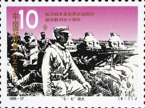 第二枚邮票为“七·七战火”,是1995年9月3日发行的《抗日战争暨世界反法西斯战争胜利五十周年》纪念邮票的首枚,长40毫米,宽30毫米,面值10分,定格了中国守军第29军在卢沟桥头严密布防、抗击侵略的历史场景。邮票上威严镇定的指挥员身边,几挺捷克ZB-26式轻机枪严阵以待,即将发出全民族抗战的怒吼。这款机枪于1926年在捷克斯洛伐克布尔诺国营兵工厂(英文简写ZB)批量生产,次年我国开始进口和仿制。全面抗战爆发前,该枪在我国已超过12万挺,抗战期间又仿制了近4万挺。它口径7.92毫米,用20发弹容弹匣供弹,结构简单,性能稳定,可单发、点射、连发,射击精度极高,有效射程在900米内。值得称道的是它的二三发点射,日寇被瞄准开火后往往都是身中数弹,当场毙命。该机枪更换枪管只需四五秒钟,是压制“歪把子”轻机枪的利器;其弹道极为稳定,易于训练掌握,被誉为中国步兵抗战的“完美武器”。只可惜数量太少,抗战中我军火力绝大多数情况仍处于劣势。
