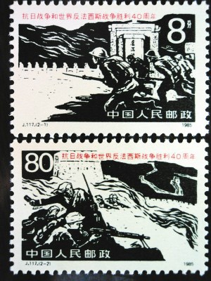 第一枚邮票为“八路军和民兵战斗在长城内外”,是1985年9月3日发行的《抗日战争和世界反法西斯战争胜利四十周年》纪念邮票的第二枚,长40毫米,宽27毫米,面值80分。邮票主图以长城为背景,展现了民兵武装配合八路军痛击日寇的场景。图中的八路军战士,正持一挺从日军手中缴获的大正十一式轻机枪,沉着冷静地射击。该枪因其在日本大正天皇十一年(1922年)定为制式机枪而得名,其枪托为便于贴腮瞄准向右弯曲,所以又被称为“歪把子”轻机枪。“歪把子”口径6.5毫米,弹容30发,采用左侧弹斗供弹。其后坐力小,连发时能保持较好的射击精度。“歪把子”的致命缺点是不能更换枪管,连续射击200发左右,枪管必须冷却5分钟以上,否则有炸膛危险。我军常利用“歪把子”的熄火间隙,集中火力打掉日军射手,从而缴获武器。