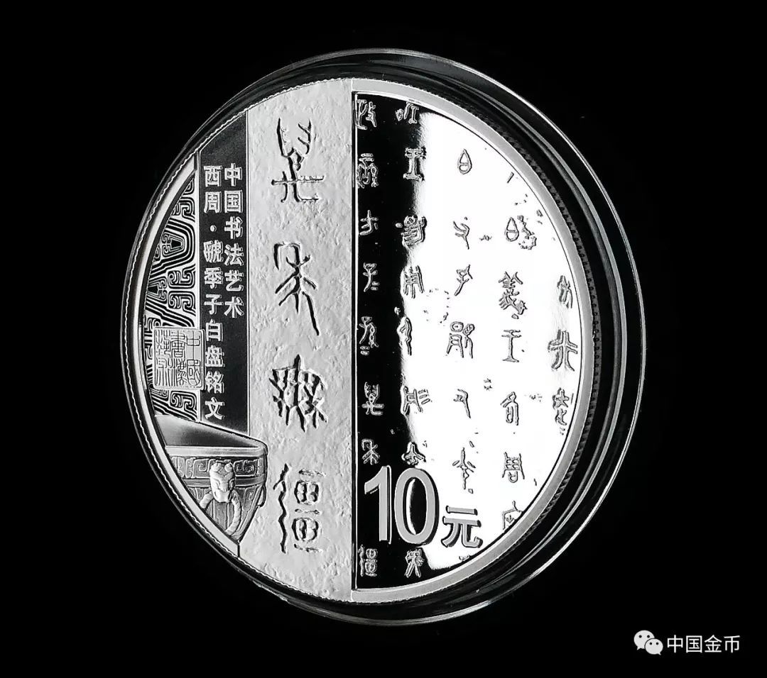 30克银币(万年无疆)背面图案为西周虢季子白盘局部铭文及其“万年无疆”字样与器物局部、“中国书法艺术”篆刻钤印等组合设计,并刊“中国书法艺术·西周·虢季子白盘铭文”字样及面额。