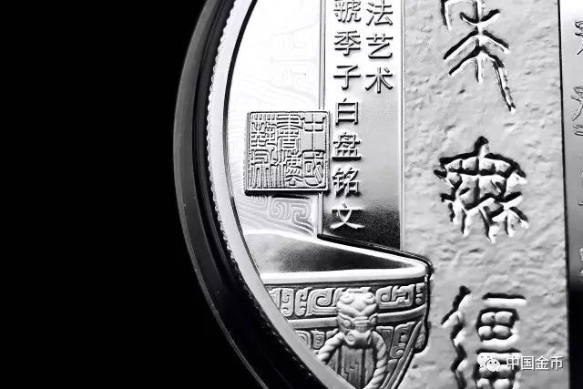 在这枚“万年无疆”30克银币上,“中国书法艺术”篆刻钤印,被置于币面左侧,像为一幅书法作品落款盖印,也像是对这件国宝最终有一个好归宿的见证。