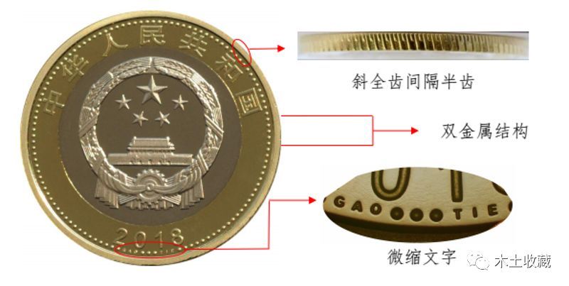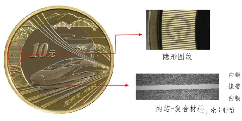高铁币和之前的10元普通纪念币一样,由黄色铜合金、白铜和镍构成,重量未知(可参考其它币的重量),其外圈为黄铜合金,内圈为含镍带的白铜。在这里需要说明一下,具有弱磁性的镍带很有意思,便于专门的“ATM”识别回收,即机读特征。另外,用手直接拿高铁币,会对币的品相造成严重后果,如果打算收藏传家的话,建议不要直接上手,包浆是盘不出来的。