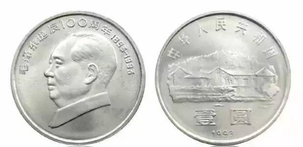 该枚纪念币背面图案为毛泽东肖像及“毛泽东诞辰100周年1893--1993”字样。注:侧边缘滚字图案是“中国”的汉语拼音文字“ZHONGGUO”及3个五角星。