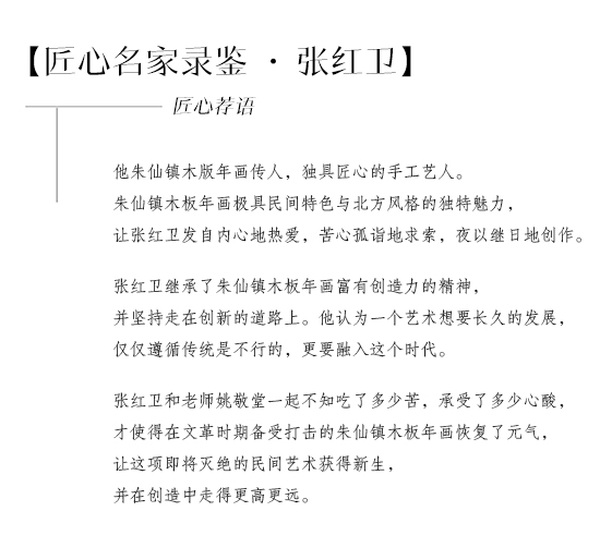 张红卫,朱仙镇木版年画传人。从小热爱木板年画的他,在老师姚敬堂的带领下,取得了瞩目的成就,现担任朱仙镇年画研究会副会长,年画协会会长。从小热爱木板年画的他,在老师姚敬堂的带领下,取得了瞩目的成就。木板年画与温文尔雅的文人画不同,它紧密的联系着普罗大众的日常生活,一张年画是一个故事,象征着国泰民安,福禄喜庆。鲁迅先生曾赞扬朱仙镇木板年画,雕刻线条粗壮有力,很朴实,人物也没有媚态,具有北方木板年画独有的特色,他曾收藏了许多朱仙镇木板年画作品,可见对其的喜爱。正是木板年画这样独特的魅力,让张红卫发自内心地热爱,苦心孤诣地求索,夜以继日地创作。