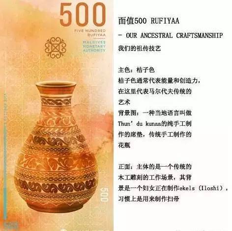 MVR500 新钞的主题是“我们祖先的手工艺术“ 一个工匠正使用木槌和凿来雕刻漆器,一个女人在做一个扫帚。你能想到背面的精美漆器上的图案,是基于以前手工编织的甘草垫子的图案吗?