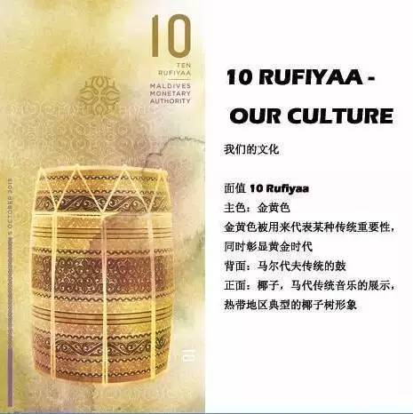MVR10 代表“马尔代夫文化和传统” 爬棕榈树的男人和一群在玩 boduberu当地打击乐器的人。 反面的图案就是 boduberu,最古老的鼓,在国家博物馆展出。