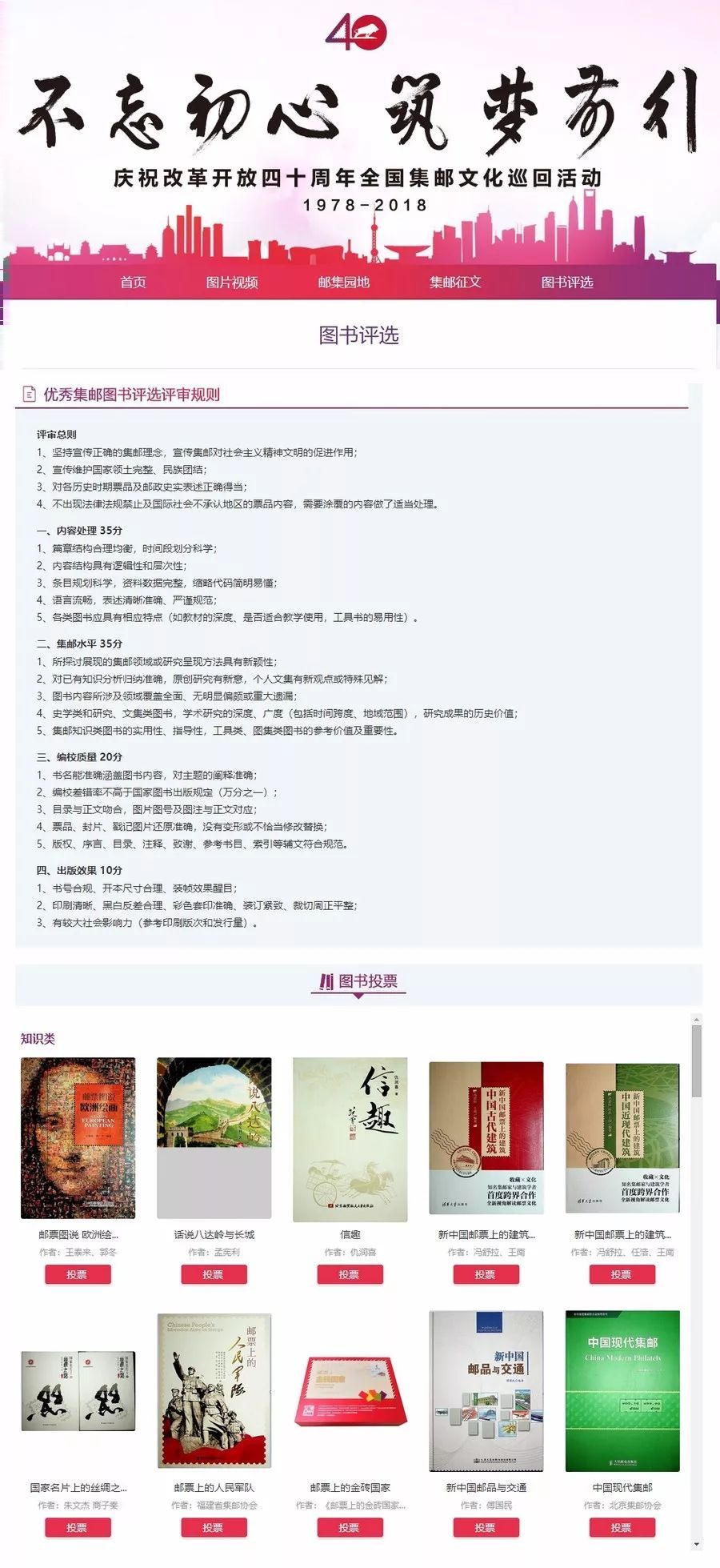 按照《优秀集邮图书评选评审规则》,经过学术委员会专家初评,现已从9大类、200余本图书中评出54本图书,进入大众评选网络投票环节。