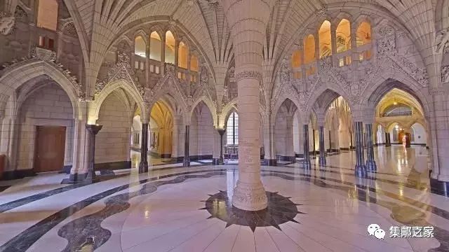 ▲背景展现了加拿大国会中楼荣誉厅(Hall of Honour)的拱顶天花。