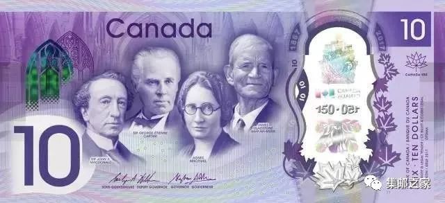 加拿大的四位历史人物登上了钞票正面,其中包括英裔、法裔、女性、少数民族代表,可谓十分的政治正确。从左到右依次是: