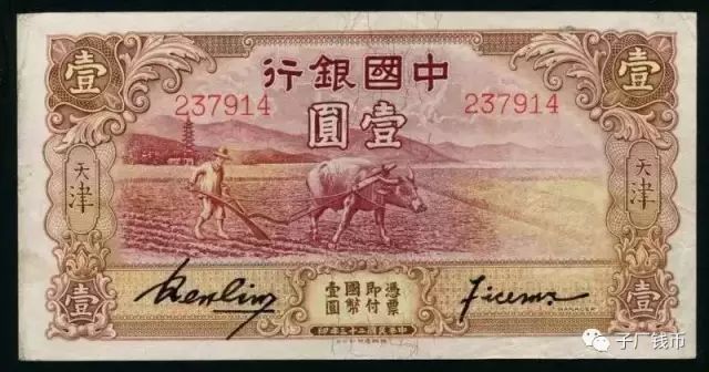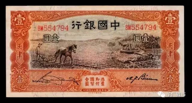 民国二十二年(1933)中国银行天津分行发现有人伪造中国银行加盖天津地名一元、十元两种纸币,认为需另换新版钞票以防止伪造。当年9月27日,中国银行总管理处函请财政部,提出拟委托英国伦敦德纳罗印钞公司印制“天津地名一元新券二百五十万张”。同年十月间,财政部“核准在案”。中国银行于民国二十三年(1934)委托英国德纳罗印钞公司印制1元、5元、10元天津地名券。其中1元券(图1)正面主色调为褐、紫,背面主色褐色,票幅81×157毫米,印刷精美;正面图案为农夫与耕牛图,背面中间为北京颐和园知春亭、右边为北京慈寿寺塔图案。这就是著名的民国二十三年中国银行天津地名“人牛耕耘图券”。