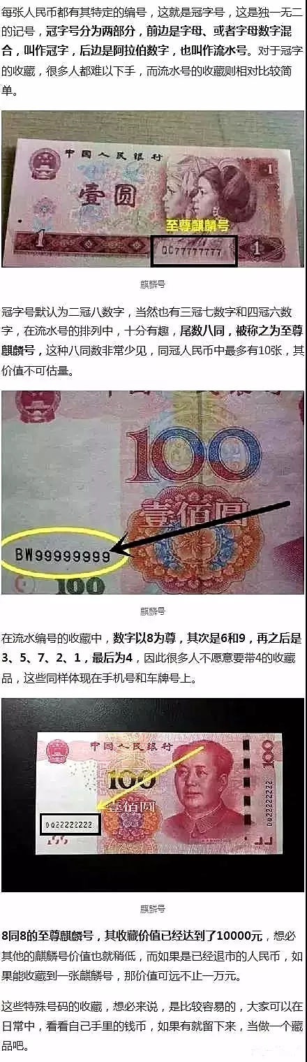 在特殊号码的收藏中,至尊麒麟号是非常难得的,一个冠字号仅仅只有一张,在八同中,8同8最为吉祥,价值也就最高,一张8同8的百元纸币已经价格在10000元左右了。