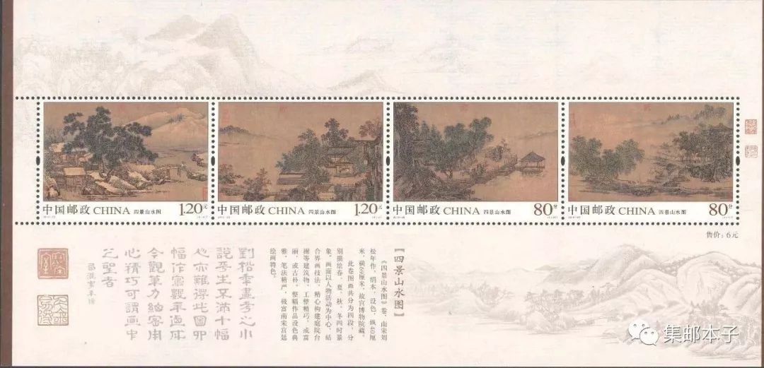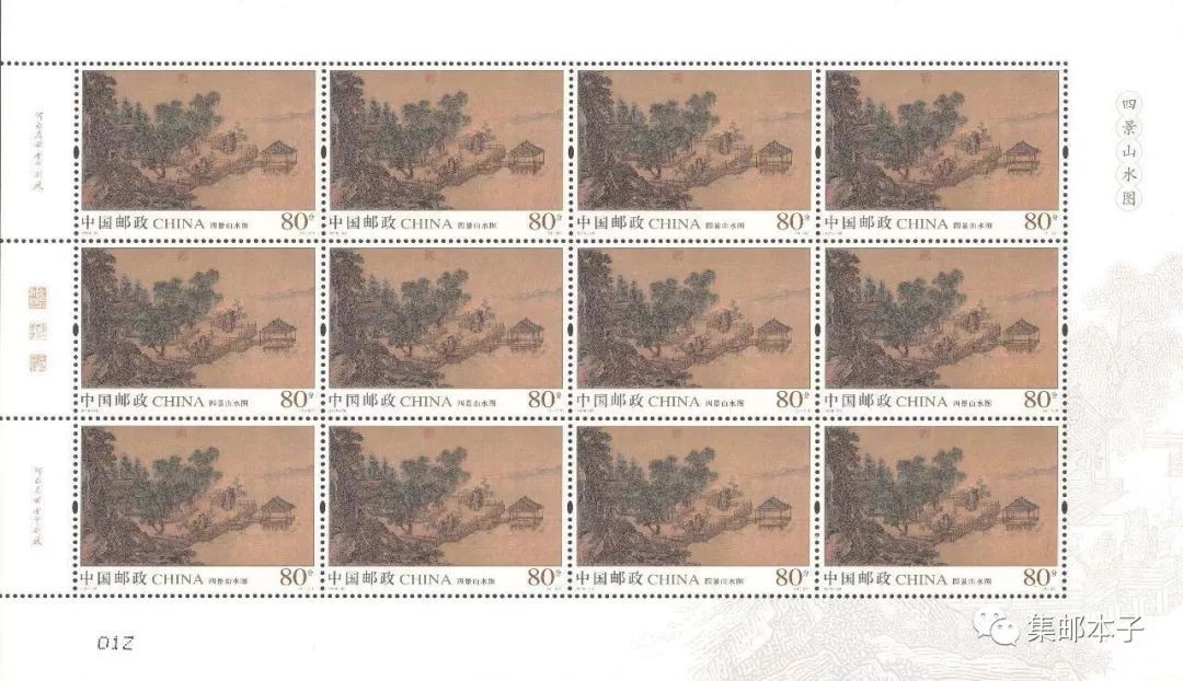 雕刻版邮票是一个珍贵的收藏品种,《四景山水图》邮票这样的雕刻,值得每一位收藏者在放大镜下细细观赏。它附着了更多的艺术和文化信息,雕刻凹印工艺复杂、成品率底,雕刻师一点一线的雕刻创作,使作品具有更高的附加值,使您能够得到独特的邮票作品,这个独特的关键点就是,每一枚雕刻版邮票都是雕刻师的版画原作。通过这套邮票,您可以与雕刻作者对话,感受雕刻独有的艺术魅力;通过雕刻凹印油墨的立体和光泽,您可以回味100多年来雕刻凹印在中国的发展和延续。雕刻凹印邮票具有广阔的收藏前景,雕刻师在创作中,心里也在暗暗地追寻着一个目标:创造一个新的高度,创造一段新的历史。这就是雕刻凹印《四景山水图》邮票的珍贵所在。
