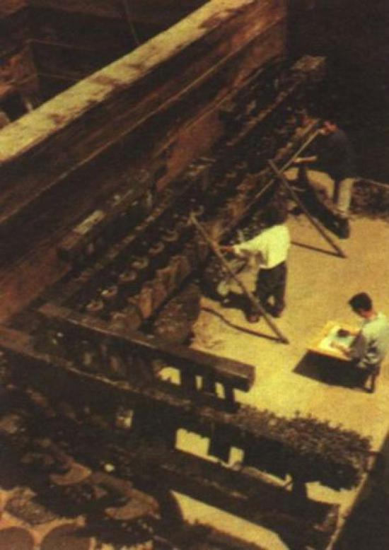 因为墓葬存在盗洞,当时考古工作者起先是很失望的。但两个月后,随着墓坑里面的积水几近抽净时,编钟露出了水面。紧接着,一个面积为220平方米的大型岩坑竖穴木椁墓展现在了考古工作者的面前。