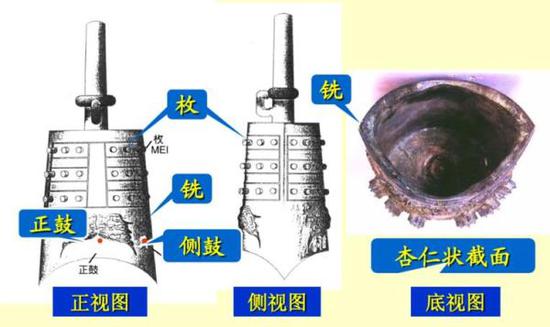 编钟呈合瓦形,与寺庙里的圆形钟不同。圆钟是整个钟部形成一种共鸣的音腔,而合瓦形的编钟就像是两个瓦片扣合住的钟。在钟口呈椭圆形,敲击时,声音一旦发出后就会停止,所以说曾侯乙编钟在演奏时不会出现敲下一个钟时,上一个钟的声音还没停止而造成的“叠音”现象。