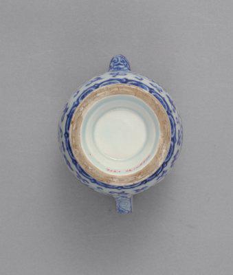 此壶大小适中,在结构上一改唐代执壶流部过短,宋、元执壶流部过长的弊端,更趋于合理化。其年款不署在底部而署于流上,审视中国历代陶瓷执壶,此种署款方式唯宣德朝所独有。此外,宣德官窑瓷器年款有些还署在器物的口沿、颈部、肩部、腹部等处,故有“宣德年款遍器身”之说。