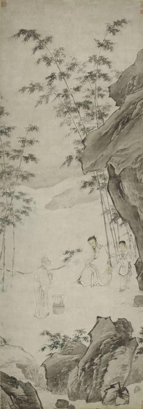 《右军书扇图》(局部)此图的笔墨技法为兼工带写的面貌,已脱出摹古的格局。尤其人物的白描功力相当深厚,人物脸部的线描柔和细劲,须眉丝丝可见;衣纹的用笔简洁畅利;周围山岩岗石,以刚健的笔势和着水墨随意勾斫皴染,表现出峻强的气势;修竹的笔墨挺发而秀逸;远处坡岸淡墨抹染,益增渺远的空间感。整幅画面,各个人物神态生动,环境氛围契合情节,笔法刚柔相济,墨色浓淡虚实相参,可称是一幅有情有景有意蕴的人物故事画。推断此图应是仇英盛年艺术臻于成熟期的铭心之作。