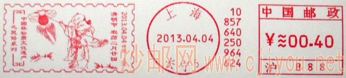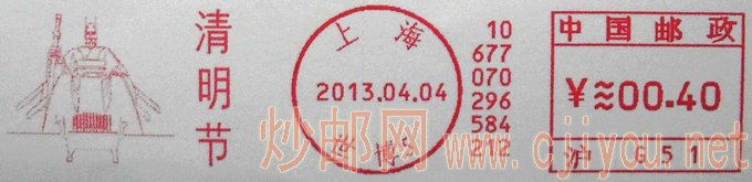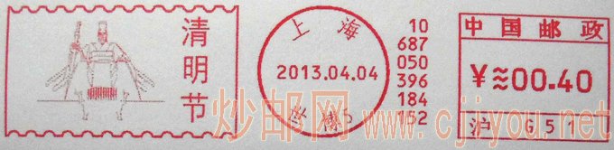 2013年4月4日是中国传统节日“清明节”,清明作为节日,在我国广大地区有进行祭祖、踏青、放风筝、插柳等一系列活动。当日上海市启用多枚清明节邮资机符志,其中包括在上海市西的北新泾、仙霞路、天山、新华路、长宁、静安、曹家渡、静安电信、石门二路等九邮局启用的二十四节气系列“清明”邮资机戳;上海市区的长宁、徐汇、仙霞路、静安、普陀、黄埔、杨浦7个邮局“中国非物质文化遗产之系列——清明节”邮资机戳;以及在世博邮局启用的重大节日系列“清明节”邮资机戳,世博邮局启用的邮资机戳分为有框和无框两种。