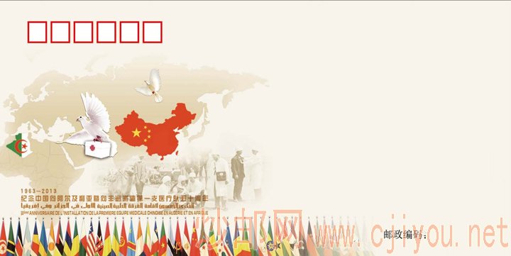为庆祝中国向阿尔及利亚暨向非洲派遣第一支医疗队五十周年,外交部集邮协会特别推出中国向阿尔及利亚暨向非洲派遣第一支医疗队五十周年纪念封(上图)。