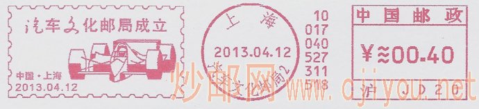 汽车文化邮局是由嘉定区邮政局精心打造的上海首家以“汽车文化”为主题、集多种邮政服务于一体的特色邮局。它的开办旨在融入嘉定汽车文化发展,在满足车迷及集邮爱好者需求的同时,进一步完善“汽车嘉定”城市形象建设。“汽车文化邮局”除了平常的邮政服务外,还将配合汽车城各项重大活动推出相应的邮戳、纪念戳加盖服务,同时推陈出新不断开发各类主题文化产品,如汽车明信片、纪念封、邮折、车模及其他汽车产品,为邮迷和车迷的汽车城之行锦上添花。为了纪念汽车文化邮局开局,上海邮政特启用“上海汽车文化邮局”风景邮戳一枚,该风景邮戳主图为一辆抽象的老爷车正朝您开来,老爷车的下面为“20.13.04.1”2字钉,上半圈和下半圈的文字分别为“上海”和“汽车文化邮局1”,该风景邮戳为钢质,可以调换字钉。上海汽车文化邮局同日还启用了“汽车文化邮局成立”DM300必能宝邮资机宣传戳符志一枚,主图为一辆抽象的精典赛车。
