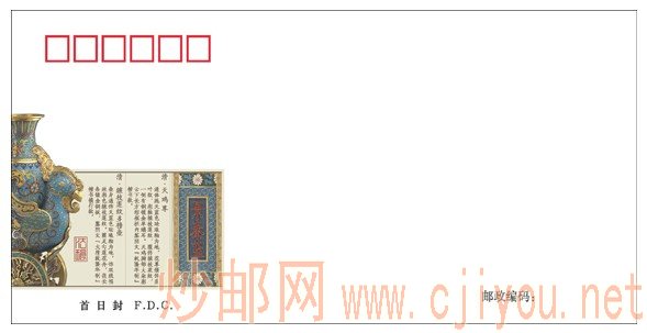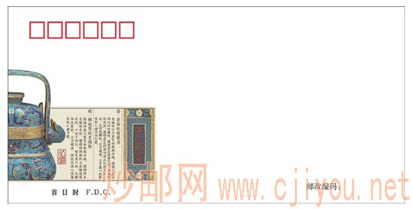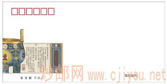 配合邮票发行,中国集邮总公司将于邮票发行同日推出《景泰蓝》特种邮票首日封,全套3枚,每枚贴两枚邮票,销总公司首日戳,售价11.6元,上图为首日封图稿。