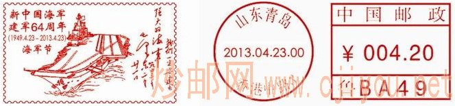 4月23日是中国人民解放军海军建军64周年纪念日,山东青岛市南区邮政局将在香港中路邮电支局独家首发 “新中国海军建军64周年海军节”邮资机纪念戳一枚。该款邮资机纪念戳戳图由“辽宁舰”航母和“毛主席题词”为主要元素构成。