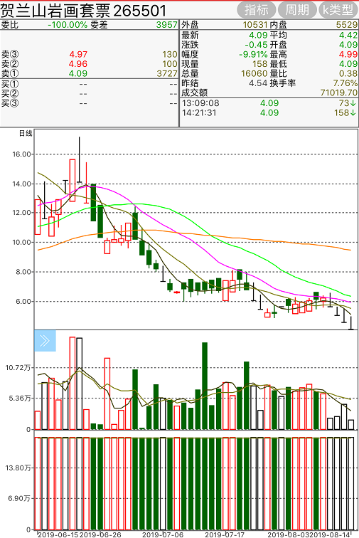 《賀蘭山岩畫套票》該票今日再次跌停,近期意圖不明,切勿盲目抄底。尾盤收於4.09元,下跌9.91%。建議觀望。