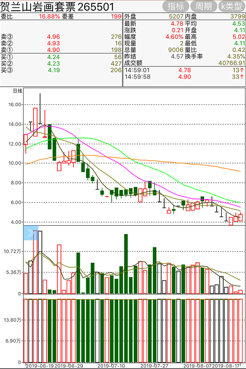 《賀蘭山岩畫套票》該票今日盤中震盪,近期意圖不明,切勿盲目抄底。尾盤收於4.78元,上漲4.60%。建議觀望。