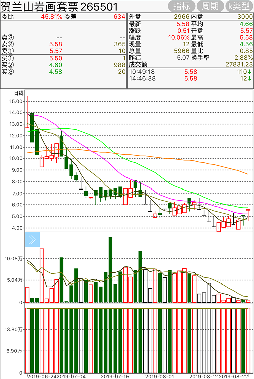 《賀蘭山岩畫套票》該票今日盤中震盪,近期意圖不明,切勿盲目抄底。尾盤收於5.58元,上漲10.06%。建議觀望。